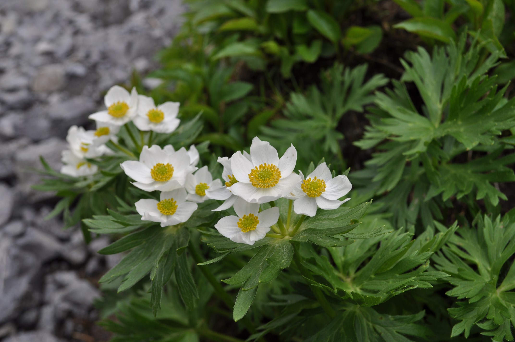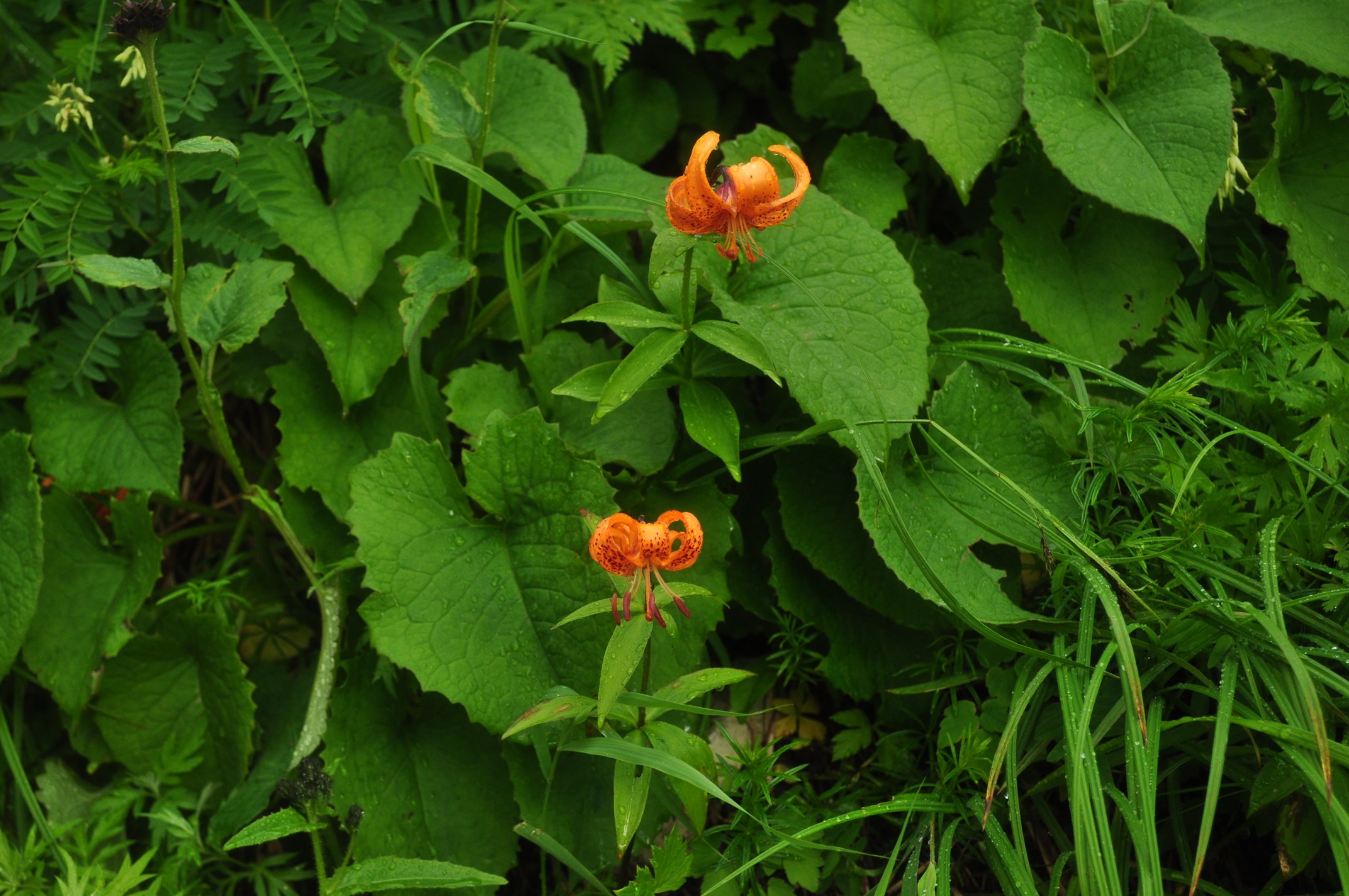 前から順番に「ハクサンイチゲ」「テガタチドリ」「クルマユリ」「ミヤマカラシ」。