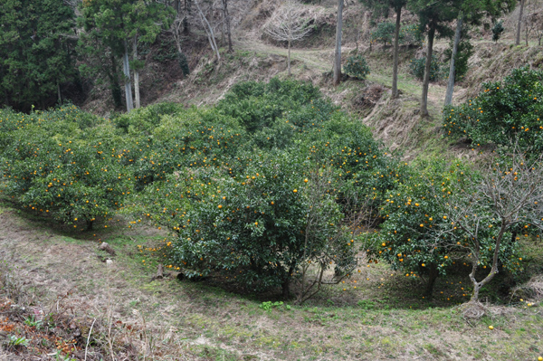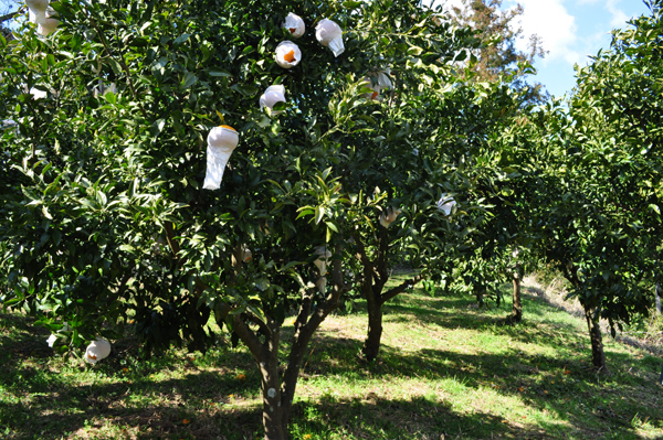既に切り取られた蜜柑から袋をはぎ取る作業と貯蔵用の入れ物に入れる作業。