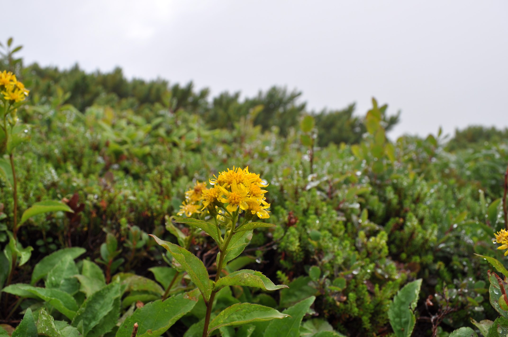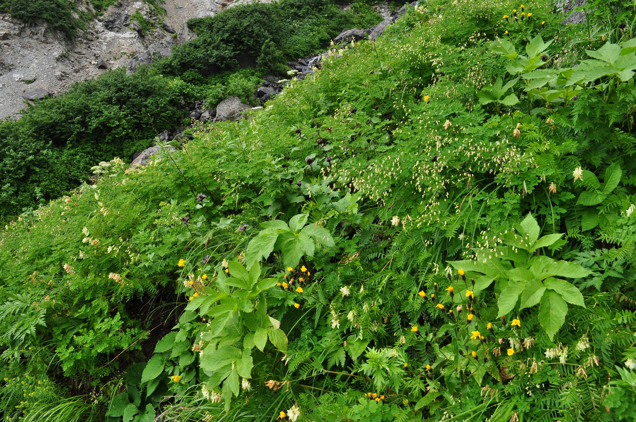 前から順番に「ハクサンイチゲ」「テガタチドリ」「クルマユリ」「ミヤマカラシ」。